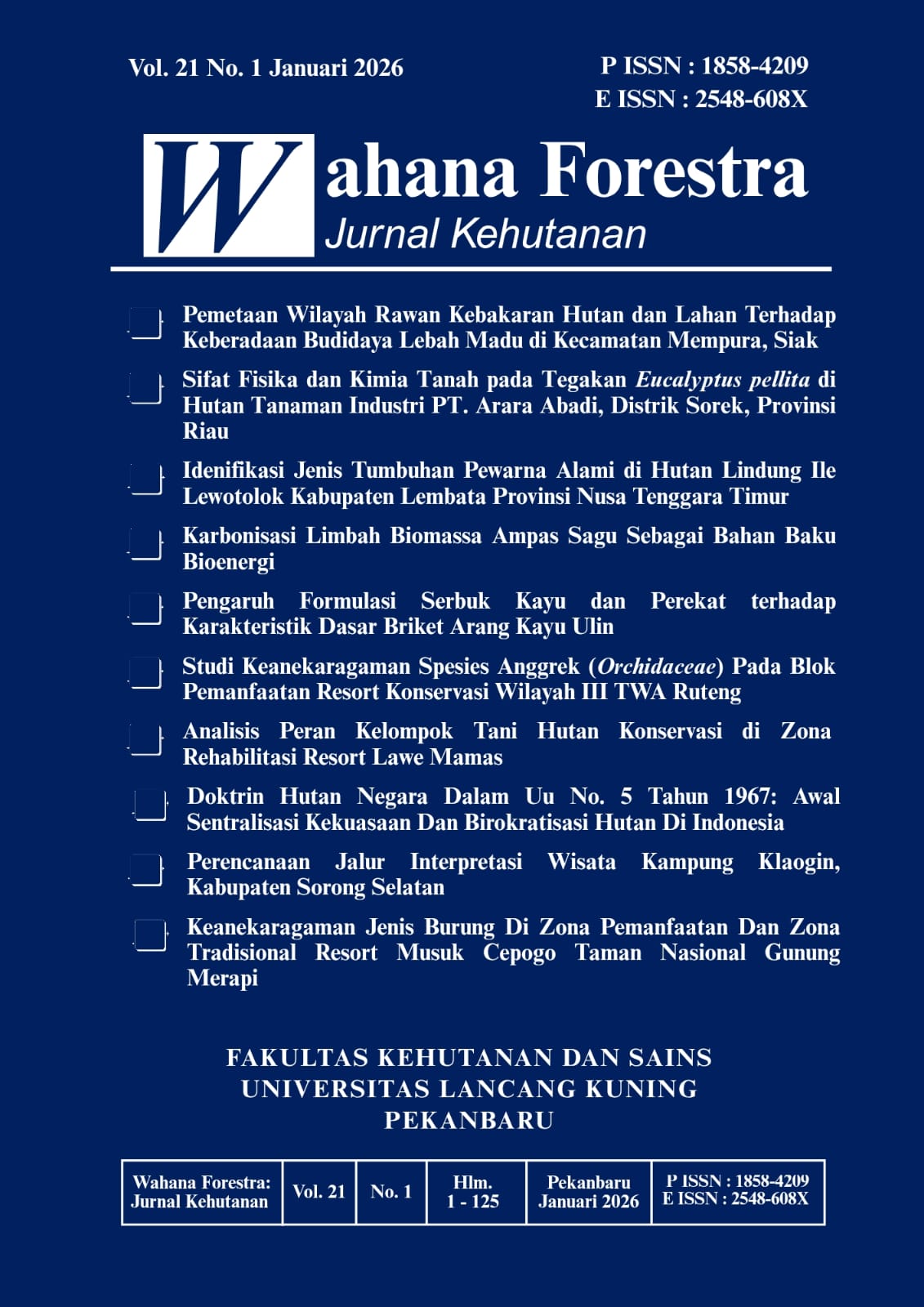 Wahana Forestra: Jurnal Kehutanan Vol. 21 No. 1 ini menyajikan berbagai aspek yang mencakup semua aspek perencanaan hutan, kebijakan kehutanan, ekologi hutan, pemanfaatan sumber daya hutan, inventarisasi hutan, silvikultur, pengolahan hasil hutan, konservasi sumber daya hutan, sosial ekonomi hutan dan lingkungan. Bahasan-bahasan yang disajikan merupakan hasil penelitian para akademis dan praktisi yang memiliki nilai tambah dalam temuan mereka berkaitan dengan menambah khazanah keilmuan seputar kehutanan dan lingkungan. Wahana Forestra: Jurnal Kehutanan telah melewati standar penulisan jurnal ilmiah yang sesuai dengan standar Open Journal System.